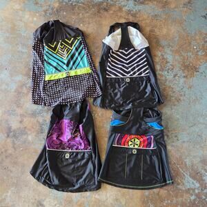 Lot of four Moxie biking jerseys with back pockets, zip side pocket, and reflective details. Size mediums and one small. Gently preowned, size has worn off on a few tanks.