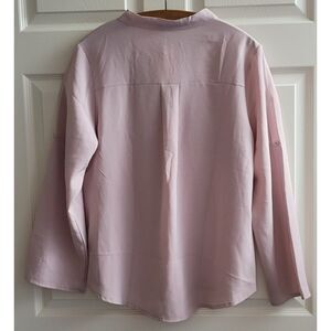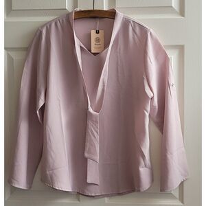 For sale is this Moyabo Womens L Bow Tie Neck Roll-Up Long Sleeve Corpcore Pink Chiffon Blouse NWT. Comes from a Smoke-Free Shop.
