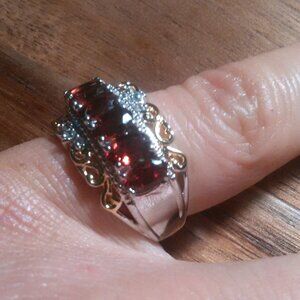 This gorgeous ring features the gemstone Mozambique garnet with accenting white zircon stones. The ring is set in 18K yellow gold and platinum bond over brass and is size 5. 2.15 ctw. Brand new.