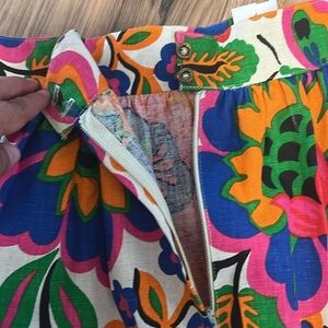Turn heads in this stunning vintage maxi skirt from Mr. “B” of California, featuring an ultra-bold multicolor floral print on a durable, canvas-like cotton fabric. This piece radiates 1960s/70s boho vibes with its vibrant palette of orange, pink, blue, and green. The skirt has a flattering A-line silhouette, subtle pleats at the waist, a ruffle hem, side metal zipper, and dual button closure for a secure fit. Unlined, but thick and structured.
