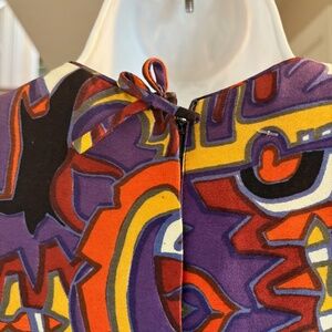 This is a beautiful dress custom made by Mr Blackwell. There is no size tag but would fit a small ( see measurements). We believe it is a silk or silk blend and is fully lined. It has an artsy design in shades of purple, black, orange, yeloow , burgundy and white. It zips up the back with a decorative bow on the back of the neck. The bust measures 34", waist measures 30", length is 52"with a 8" slit in the back. Although it is vintage it appears to be never worn!