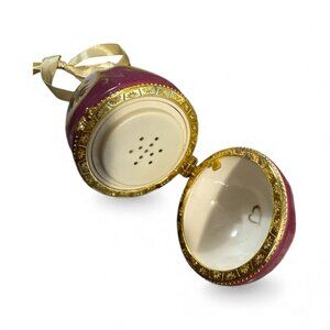 This elegant egg-shaped ornament plays music, adding charm to holiday decor. Its rich burgundy and gold accents exude timeless sophistication.