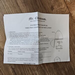 Operation: Per instruction sheet, music plays when the lid is opened and stops when closed. Music mechanism and battery compartment are in the top lid. Included: Ornament, instruction manual, and patterned gift box. Bottom stickers read "MADE IN CHINA" and "Q.C. PASSED." No UPC or style code visible.