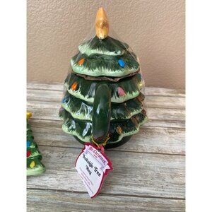 Both pieces are modeled after the beloved mid-century ceramic Christmas trees from the 1950s–1970s, featuring colorful “bulb” lights and a golden star topper.