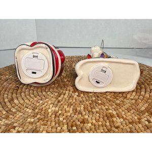 Merry Mr. Christmas! For your consideration are these 2 cuties--one Santa and one Reindeer. They have little vintage style bulbs that light up--please see photos for demonstration of them turned on. They have an 'on' feature and a 'timer' feature. These can sit on a surface OR hang from your tree from the top metal loops and strings. They are in fantastic condition with every little vintage style bulb intact and lighting up. Please see our detailed photos --you will see they are in excellent condition and ready for your Christmas display!
