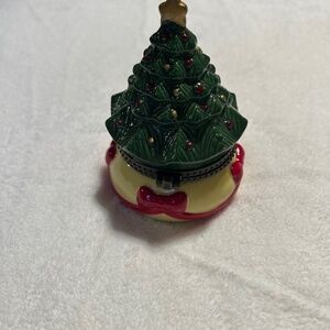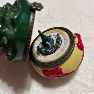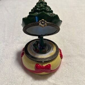 This piece is so very cute. The music box opens and rotates the train around the tree. Great condition. 4 1/2 inches tall.