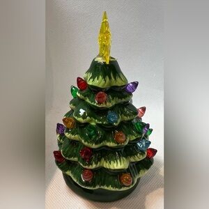 Nostalgic, vintage look, light up ceramic Christmas Tree. Battery operated. Yellow star on the top. Good, used condition.