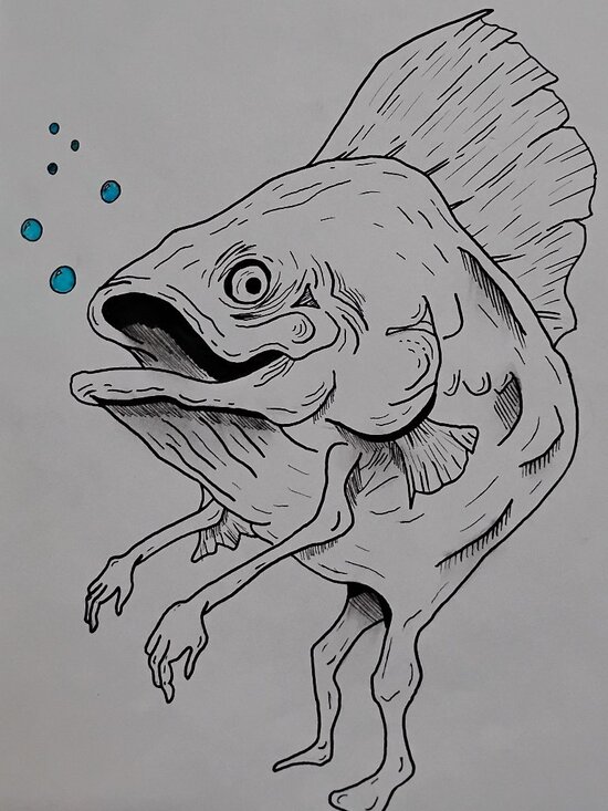 An ink drawing of a fish man creature.