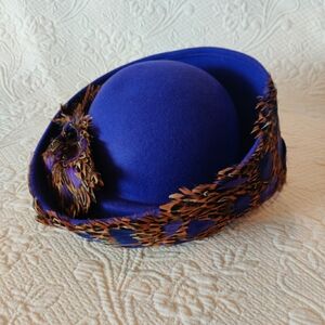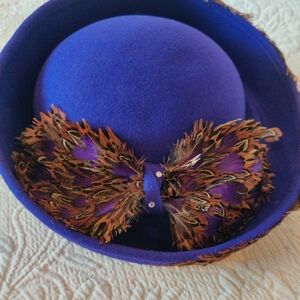 The product is a vintage Mr. John New York Paris classic bullman hat made of 100% wool, featuring pheasant feathers and a tailored look typical of the 1950s style. This special occasion hat is in a classic purple color and is designed in a size medium. Made in the United States, this original piece exudes a timeless elegance and sophistication, perfect for adding a touch of vintage charm to any outfit. Note the hat is a purple The pictures are showing more of a deep blue purple, and very good condition slightly used
