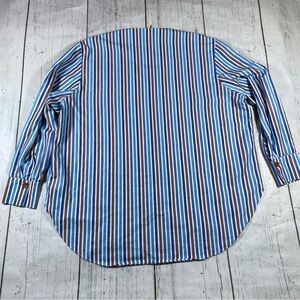 Size Xsmall. Mr. Larkin Collarless Oversized Striped Button Down Shirt. Shirt features shades of blue and brown vertical stripes. larger brown accent buttons, button sleeve cuffs, and curved hem. 100% cotton from deadstock fabric. Made in Poland. All measurements are approximate. Small spot on sleeve - please see pictures.