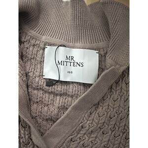 This is a Mr Mittens Lace Polo Pointelle Sweater in Almond Grey and Tan, featuring a V-Neck, long sleeves, and made of 100% Cotton lace fabric. It is a size S/XS and is a pullover style sweater suitable for winter, fall, and spring seasons.