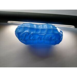 This vintage hard plastic candy container features the iconic Mr. Peanut character embossed in blue. The container is nut-shaped and originally held Planters Nuts. It was created in the 1950s and is an original piece of advertising collectible. The container would make a unique addition to any candy or nut collection or could be used for storage or display. Its blue color and vintage design make it a charming and nostalgic item. This collectible was made in an unknown country or region of manufacture.