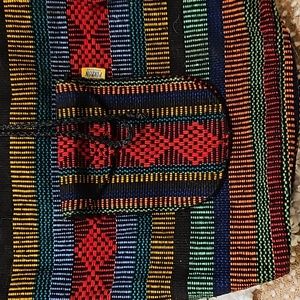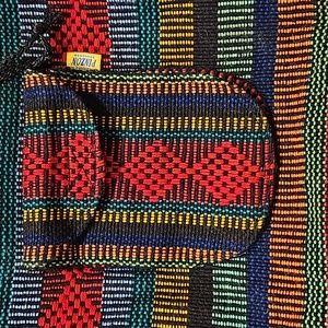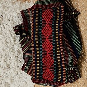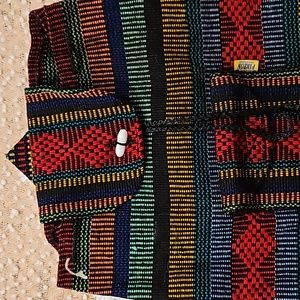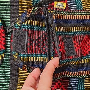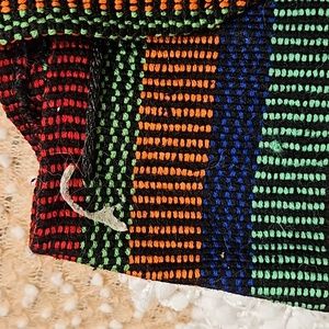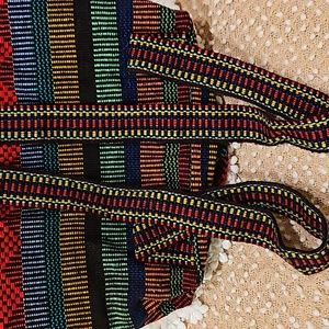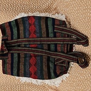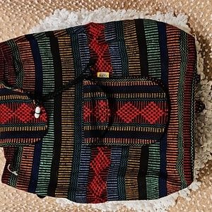 Arte Sanias Mr. Pinzon Boho style multicolor woven backpack with drawstrings and toggle closure for main compartment, front pocket with zipper and velcro closure, straps not adjustable, never used in excellent condition see all photos for details (glue mark on front see photo) approximate measurements 15" H 15" L