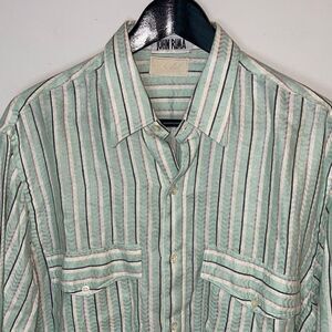 Mr Sid John Rima Vintage Mens Button Down Shirt Long Sleeve Striped Linen Green