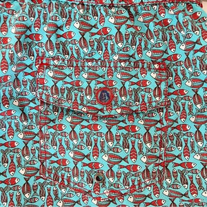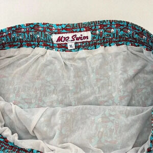 Preowned, Mr. Swim Size XLarge Swim Trunks Mesh Lined Blue/Red Fish Print 6" Inseam