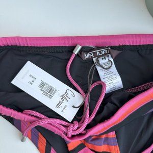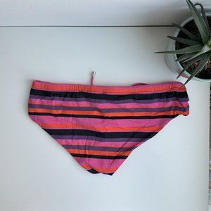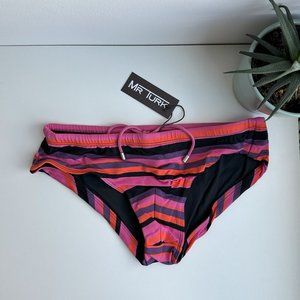 A sleek new print adorns this classic Mr Turk swim brief in horizontal stripes of red and black. From the pool to the beach, pair this chic swim brief with a caftan for a little more coverage and even more style.