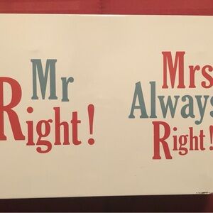 New: Mr. and Mrs. Right Mug Set. Featuring bold red and green text, these mugs add a playful touch to your dining experience. Includes two matching coasters. Small imperfection on lower right corner of tin. Adorable Gift!!! Please View All Photos.
