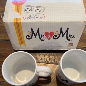 Mr and Mrs ceramic mugs and Mr and Mrs ceramic trinket tray.In Original boxes. Trinket tray is 4-3/4 x 2 inches approximately.