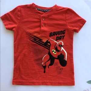 Jumping Beans red tee shirt with a black rubber print on of Disney’s Mr. Incredible