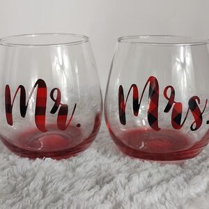These black and red plaid Mr & Mrs stemless wine glasses hold 12oz. Great for that country feel. Pre-owned and in good condition some wear on bottom of glasses (see photo #3). All offers welcome.