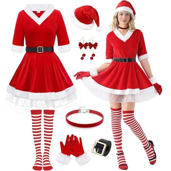 This set includes everything needed for a Mrs. Santa Claus costume: a red velvet dress, a Santa hat, a black belt, plush gloves, a choker necklace, red bow earrings and over-the-knee socks. Whether it's a Christmas party, a corporate event, a theme performance, a family gathering, or a Santa's nightgown night, this Christmas costume is the perfect choice.
