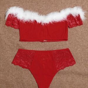 Womens New 2pc Lingerie Set. Includes Croped Lace Top with Fur Trim and Matching Lace Up Panties and Santa Hat.