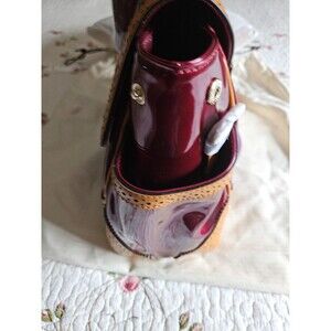 This limited-edition Ms. Bouvier by Abigail Riggs patent leather purse is a must-have for any stylish woman. With a solid pattern and maroon exterior color, this top handle bag features a magnetic closure, double handles, and gold hardware. The bag also comes with a detachable strap, bag charm, and original dust bag.