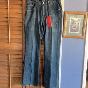 Embellished and mild distressing to these brand new Ms Firefly stretch bootcut jeans. (Flypaper Jeans) Bling crystal and embroidery starburst embellishment at the back pockets and a little at the front pocket rivets and button.