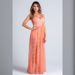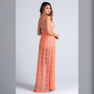 A striking solid playsuit with a plunge cutout on the bodice, V-Straps in front , and a sheer floor-length Skirt. Defined waist. Short leg openings. Adjustable shoulder straps. Sleeveless. *Actual Model