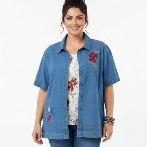 Ms. Lee 3X Blue Denim Shirt - 2 PC Look w/ Colorful Embroidery 100% Cotton