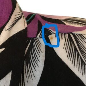 Vintage tropical floral print tunic with button-down front, short sleeves, and shoulder pads. The top of the left shoulder has a very small stain spot (perhaps rust and noted in photo 4 above) that did not come out with laundering. This flaw is reflected in the price of the shirt. Otherwise, it is in good vintage condition.