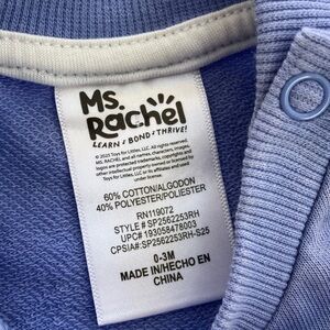 2 one piece rompers with Ms. Rachel & Barbie graphics. 60% cotton/40% polyester. Size 0-3 months. VGUC