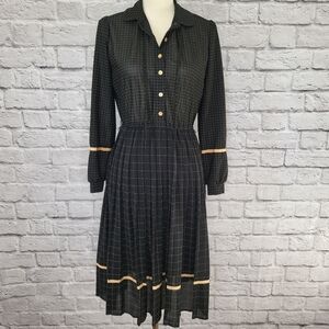 Ms Sugar dress vintage black tan plaid pleated long sleeve button front Size 8