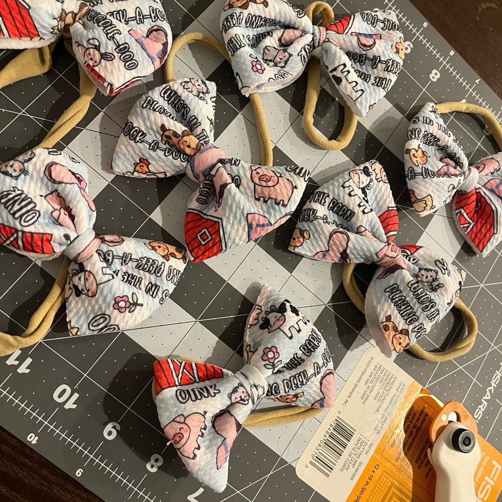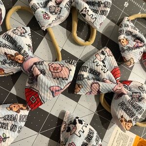 Charming hair bows with playful animal prints, perfect for adding a fun touch to any child's outfit. Featuring delightful red and white colors.