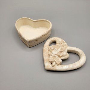 A heart shaped trinket dish or potpourri box with open lid made of clay and volcanic ash from the eruption of Mt Saint Helens, WA. Raised rose on the lid. Made by A Touch of Cougar.