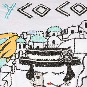 Front screen print graphic with bead, sequin, and pearlized embellishment. Self-tie hem.