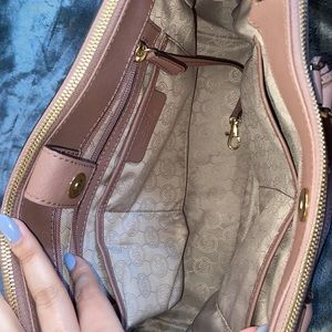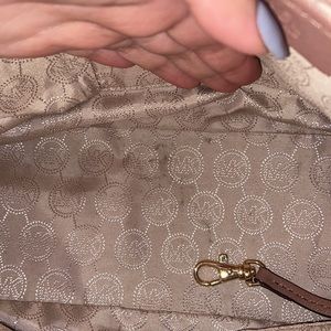 Light muave michael kors hand bag. Comes with a strap to wear as a crossbody. Gently used. Please look at pictures as there is a tint stain on the inside. Very unique and beautiful color. I don’t want it, you do. Make a reasonable offer.