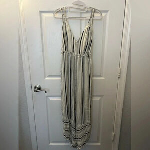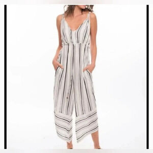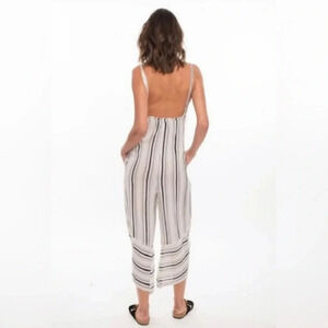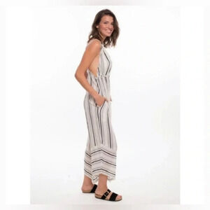 So care-free, the Faustina wide legged jumpsuit is fashioned with a scoop back that travels in vertical black and white stripes