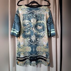 Touchdown jersey with a mirrored image of Alphonse Mucha's "femme à Marguerite".