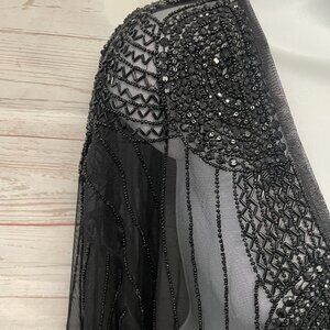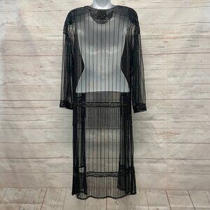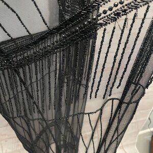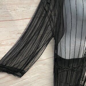 Beautiful beaded duster kimono in a sheer fabrication and fringe detailing at bottom. Intricate beadwork lends an ethereal touch to this delicate layer.