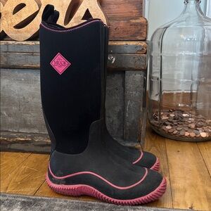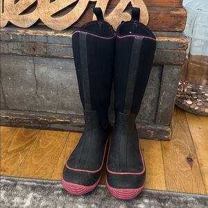 Stay stylish and dry with Muck's black and pink winter rain boots. Perfect for wet and cold weather.