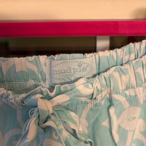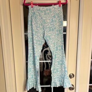 Chic aqua and white pants with a swirl design. Features a comfortable elastic waistband with drawstring