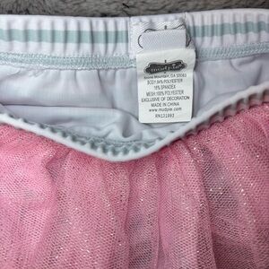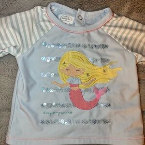 EXCELLENT USED CONDITION- Slight signs of wash wear on bottom and some part of pink detail is missing on back - shown in photos. The cutest swimsuit for the cutest beach mermaid. Rash guard. SPF protection. Snap buttons on back. Tutu bottom and sequins to make your little one feel extra girly.