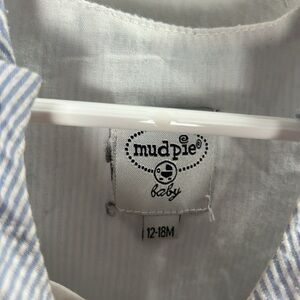 This charming blue romper from Mud Pie features a delightful embroidered Easter bunny design across the chest. Crafted from soft material, it offers a comfortable fit with its classic shorts-length silhouette. Cotton/polyester blend material. Size 12-18 months. Non smoking home.