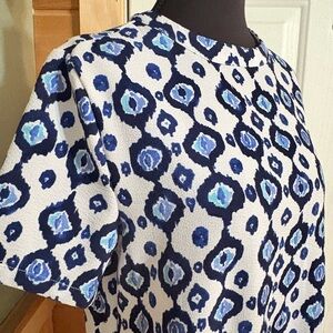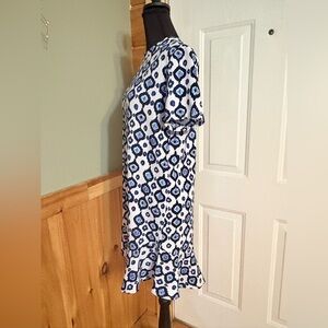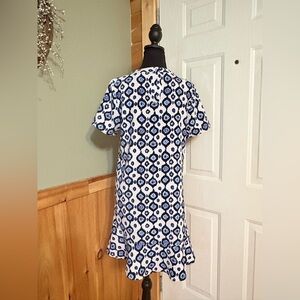 This casual sundress by Mud Pie features a striking blue and white geometric pattern, perfect for a relaxed day out. Designed with flutter sleeves and a crew neck, it offers a breezy and comfortable fit. The lightweight fabric makes it an ideal choice for warm weather, ensuring both style and ease.