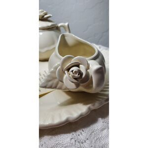 The pitcher is 3.5" wide x 1.75" tall and has a small chip on the rim where the flower is, but is very hard to see. The covered sugar bowl is 4" wide x 2" to the top of the flower. The plate has a scalloped edge and is 8" in diameter.