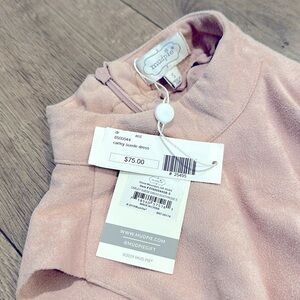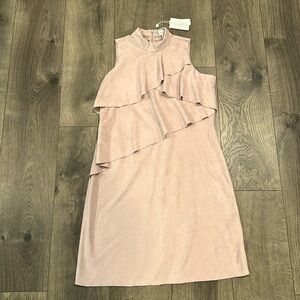Faux suede sleeveless dress features mock neck and layered ruffle chest piecing.