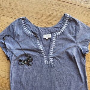 Cap sleeve vee neck dress has embroidery around the neckline and cutwork embroidery around the hem. Simple pullover shift dress is darted in the bustline. Looks great with a summer espadrille. In excellent pre-owned condition with no stains or holes. Listing is for dress only.