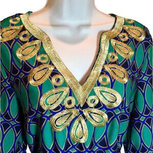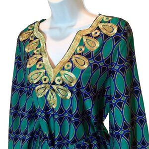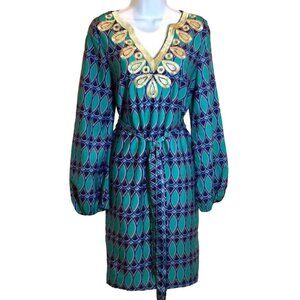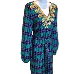 Pretty teal, navy and gold geometric print dress with gold embroidered neckline. Shift style with belt and long sleeves.