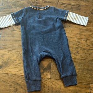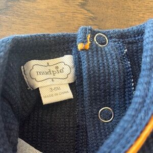 Navy Waffle knit jack o lantern boy's Baby Bodysuit features bouclé appliqué, contrast layered jersey sleeves and inner leg snap closure. Perfect for fall and Halloween season!!!